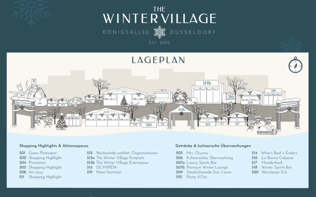 Unser digitaler Lageplan zeigt Ihnen alle Highlights, Ausstellerbereiche und kulinarischen Stationen des The Winter Village an der Königsallee auf einen Blick.